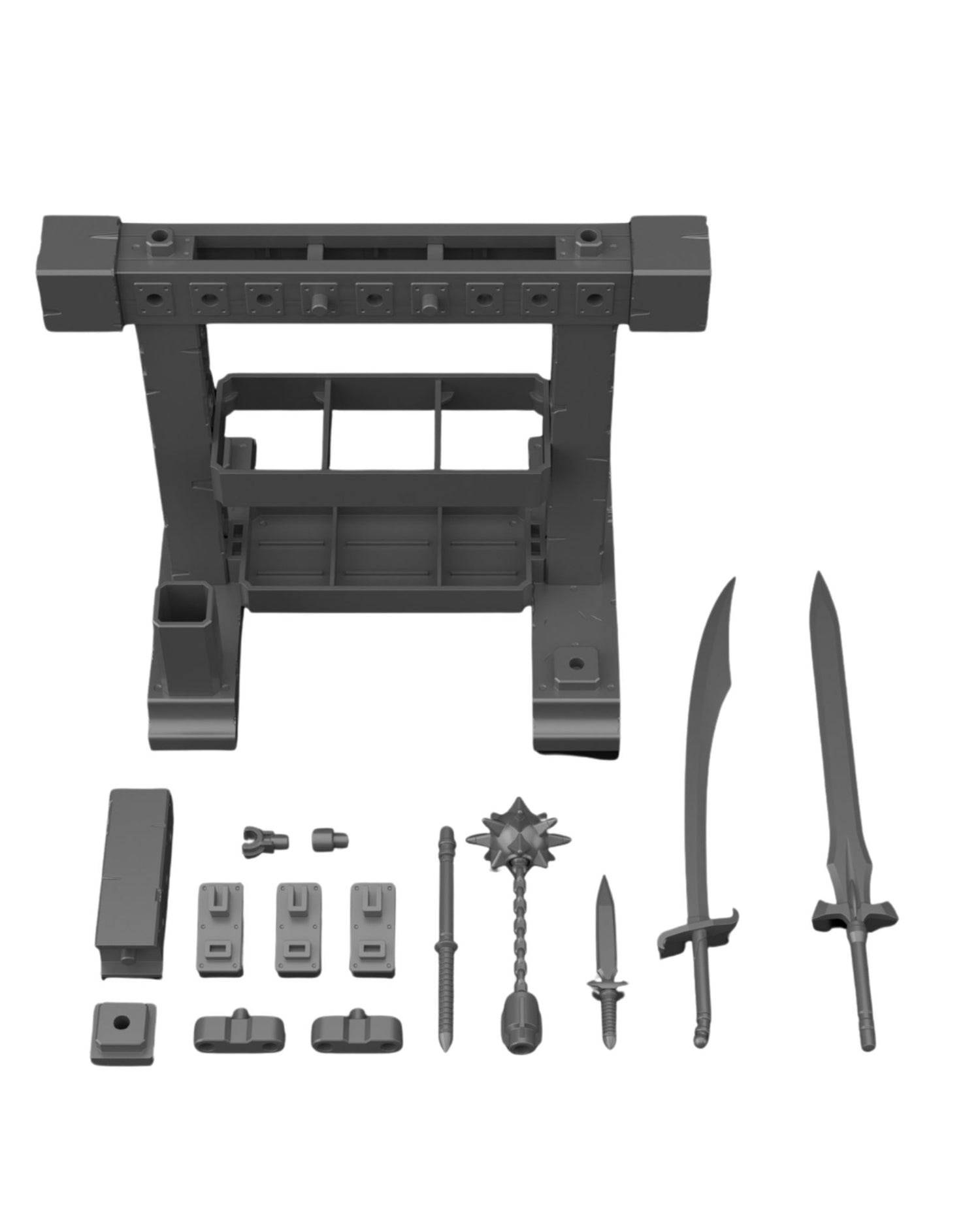 The "Weapon Rack" can display various parts such as faces, armor, and weapons sold separately.