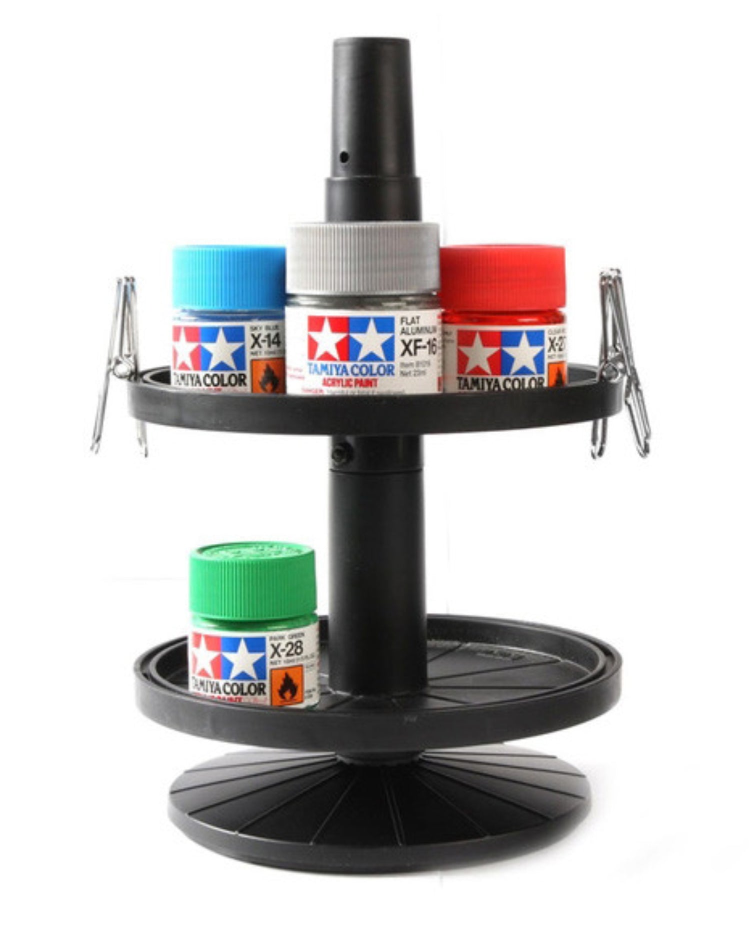 Keep your paint chaos at bay with the Tamiya Bottled Paint Jar Stand! This rotating two-tier stand holds up to 7 mini (10 ml) jars or 6 larger (23 ml) jars per tray, letting your colors spin into perfect order. Plus, each tray features a groove for alligator clips—four included—so you can dry your freshly painted parts without the mess.