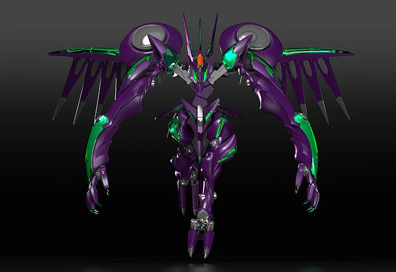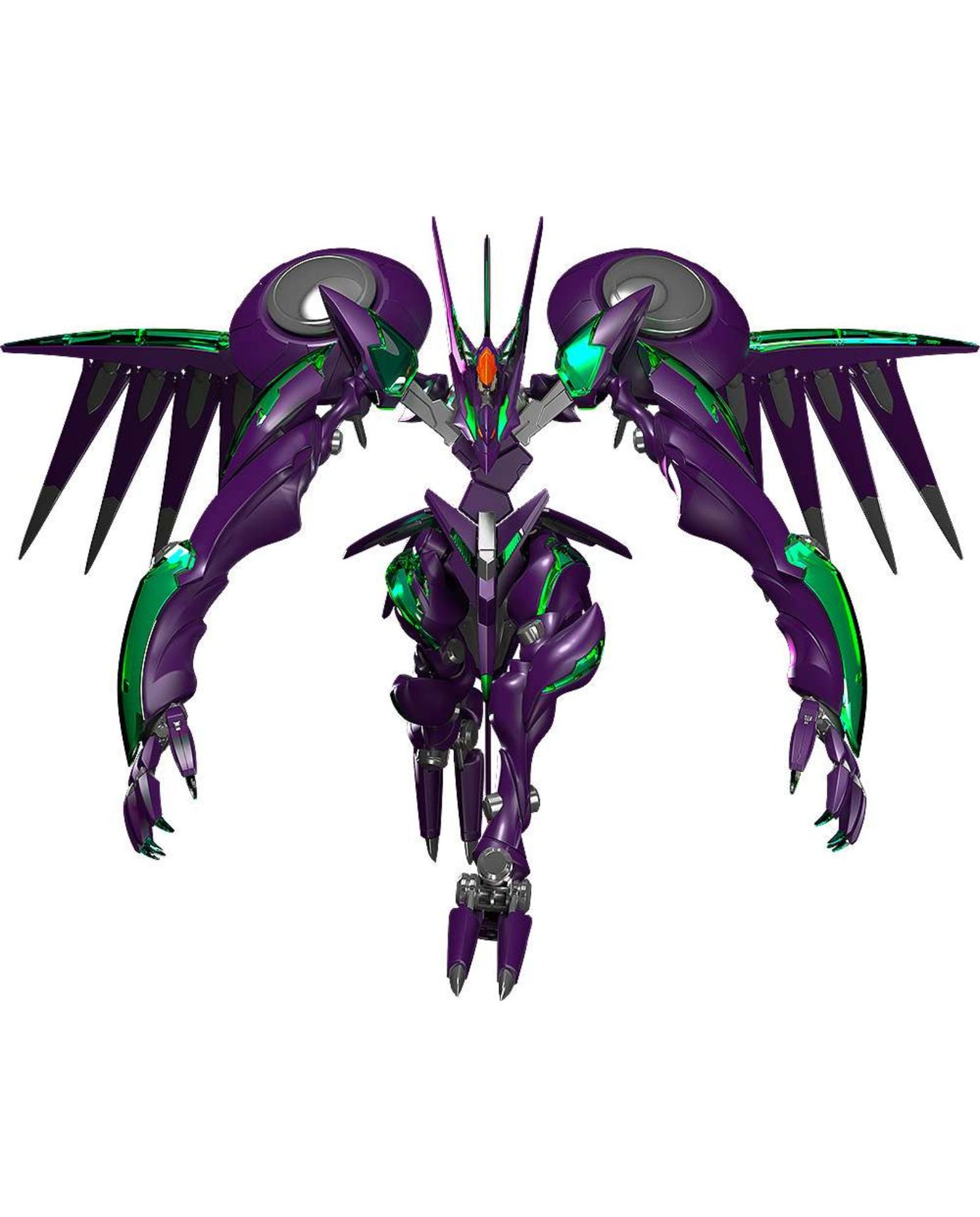 The model features fully articulated joints. Eight assimilation cables, a Luger Lance, a Luger Lance firing effect part, a Worm Ring, two back stabilizers and various replacement hand parts are included. Fafner Mark Nicht can be displayed firing its assimilation cables and deploying its homing laser oscillator. Its back stabilizers can also be displayed in standard mode or light mode. The worm ring can be equipped to its hand part.