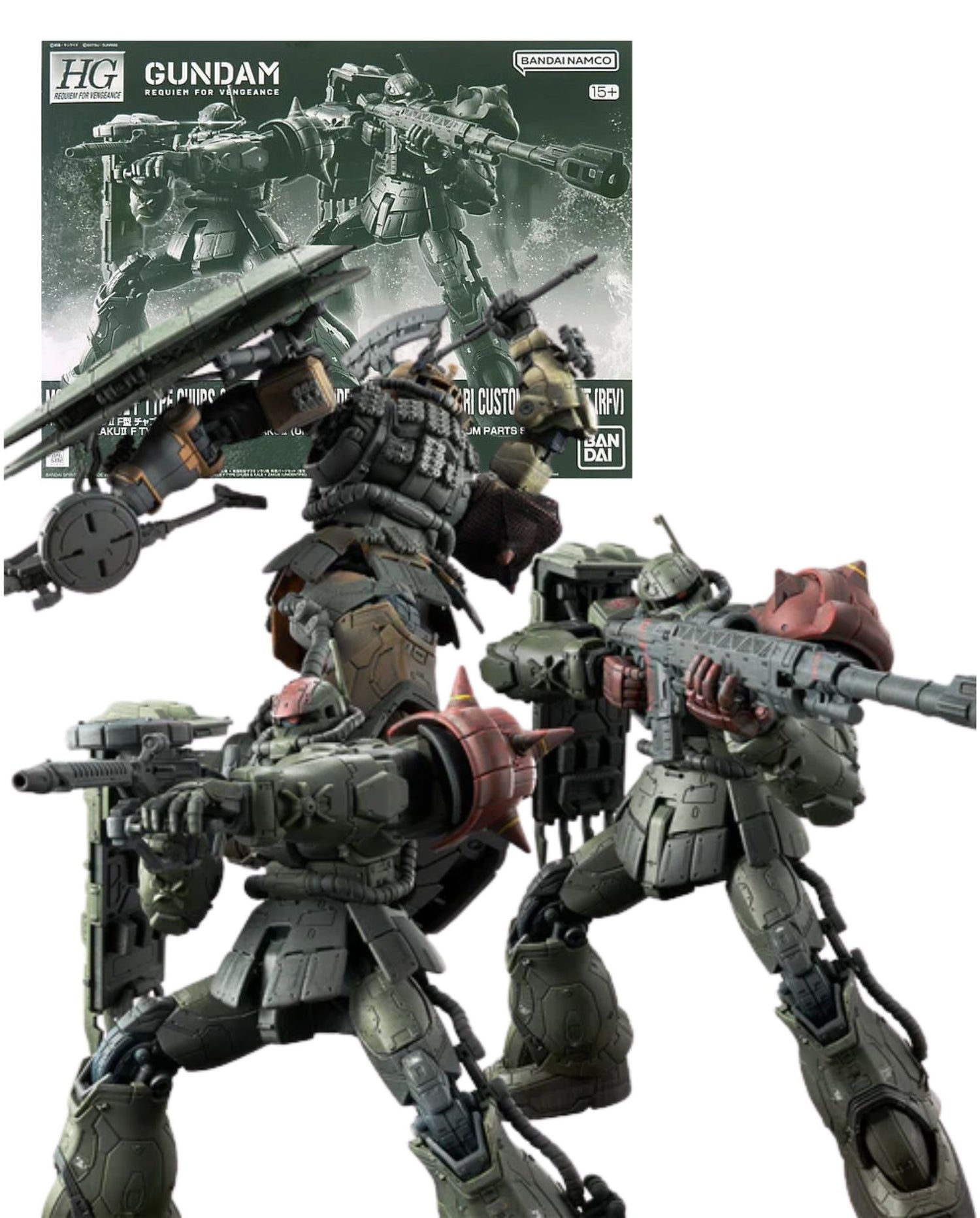 In addition to the Zaku machine gun and heat hawk, new Zaku bazooka and long rifle are included.