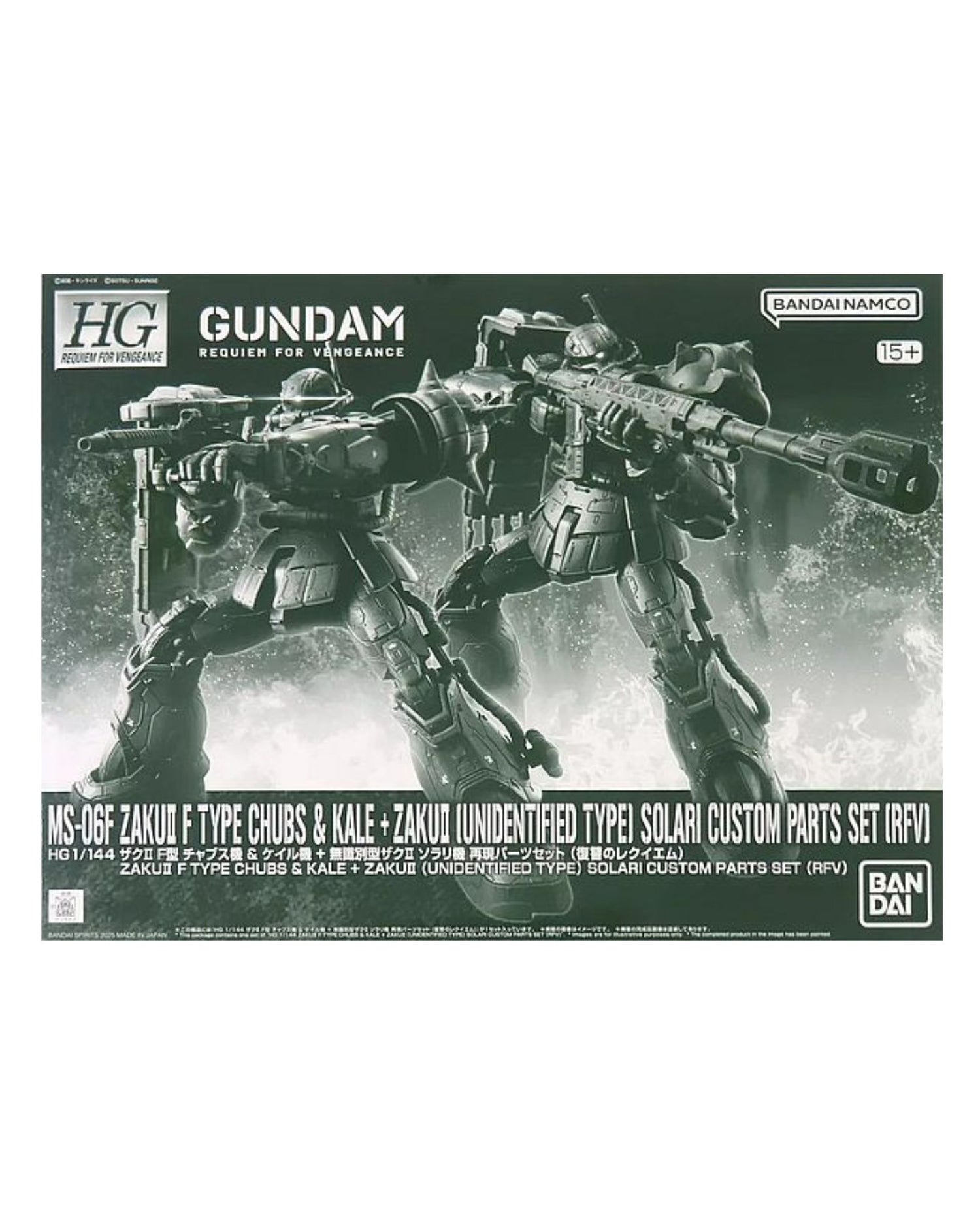 From the Netflix exclusive series Gundam: Requiem for Vengeance, the Red Wolf Team's Zaku II F Type Chubs unit and the Zaku II F Type Kale unit are being released as a set of two models. Additionally, parts to recreate the Zaku II (UNIDENTIFIED TYPE) Solari unit using the Zaku II F-Type Solari Unit (sold separately) are included. These models are meticulously recreated capturing the full CG details of the mobile suits in 1/144 scale.