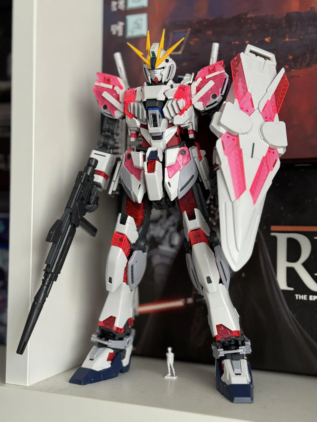 The "Narrative Gundam C-Packs" mobile suit, created as a psychoframe test unit, is now available in the MG Ver.Ka series. This model is packed with various features that Hajime Katoki has thoughtfully integrated from both the narrative and plastic model perspectives. The psychoframe showcases a multidimensional design with depth, featuring clear parts of varying thickness and intricate details on the front, back, and sides. The frame reflects light like crystal, depending on the viewing angle. Included is a gray psychoframe that does not activate NT-D, allowing for selective usage. The components are designed to align with the "MG 1/100 Unicorn Gundam Ver.Ka," respecting the storyline settings. Each hip joint is independently movable. The knee fins retract as the knees bend, enabling deep leg bends. The nose can rotate from the core block form to transform into a bird-like Core Fighter. It comes with a C-Packs beam rifle, an upgraded version of the rifle for the Jegan. Both types can be replicated by swapping parts, thanks to the clever design. Two Yona Basta figures are included, one seated and one standing.